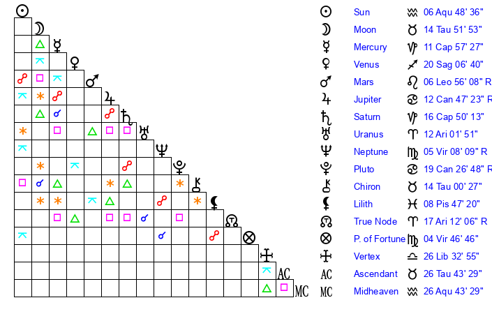 | Sun | 6 Aquarius 48 | 8 Aquarius 1 | 10 Taurus 21 |