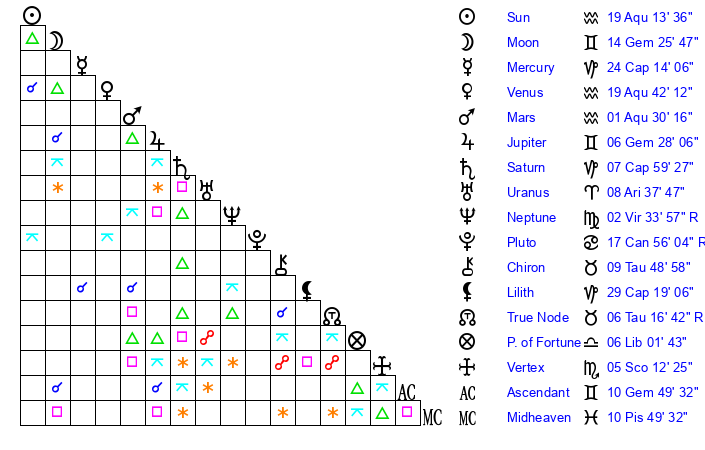 | Venus | 19 Aquarius 43 | 3 Aries 3 | 17 Gemini 18 |