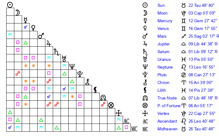 | Moon | 3 Capricorn 5 | 12 Sagittarius 46 | 7 Libra 17 |