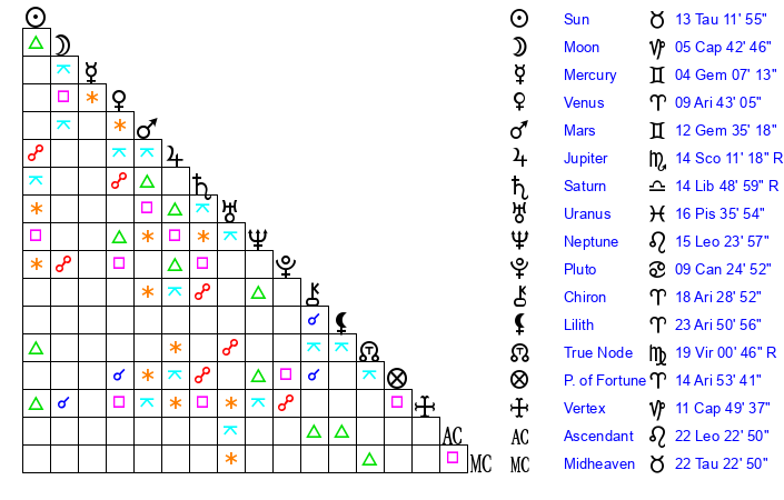 | Sun | 13 Taurus 12 | 14 Taurus 29 | 20 Leo 52 |