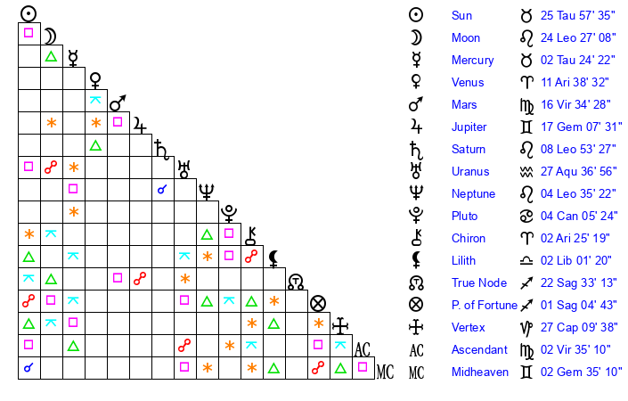 | Sun | 25 Taurus 57 | 27 Taurus 2 | 8 Virgo 25 |
