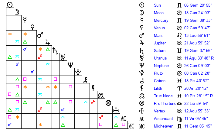 | Mercury | 19 Gemini 39 | 5 Gemini 48 | 6 Libra 44 |