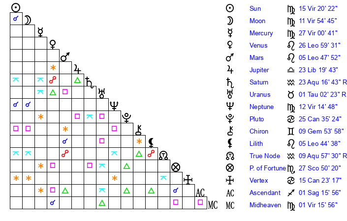 | Sun | 15 Virgo 20 | 16 Virgo 18 | 15 Sagittarius 55 |