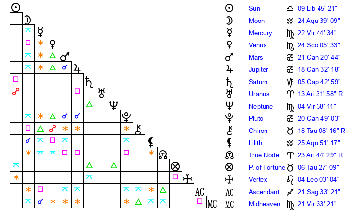 | Sun | 9 Libra 45 | 10 Libra 44 | 15 Capricorn 26 |