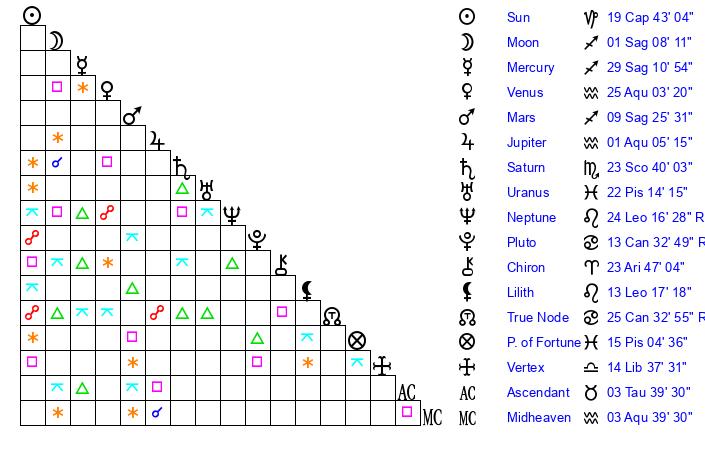 | Sun | 19 Capricorn 43 | 20 Capricorn 42 | 28 Aries 52 |