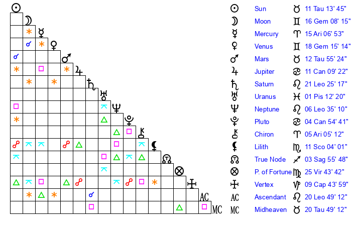 | Sun | 11 Taurus 14 | 12 Taurus 32 | 22 Leo 45 |