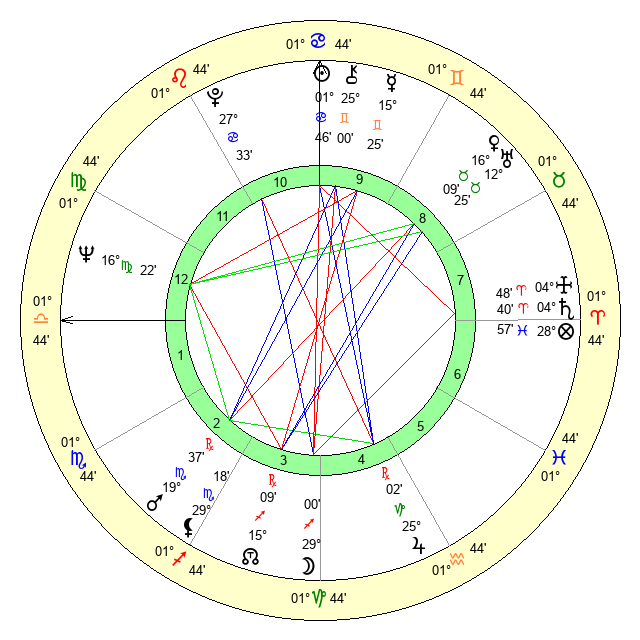 | Sun | 1 Cancer 46 | 2 Cancer 29 | 26 Virgo 19 |