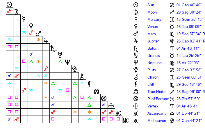 | Pluto | 27 Cancer 34 | 3 Aquarius 16 | 29 Cancer 45 |