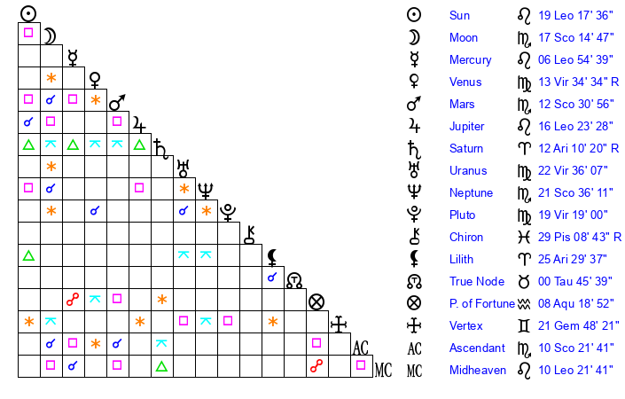 Mercury | 6 Leo 55 | 4 Leo 21 | 10 Scorpio 55 |