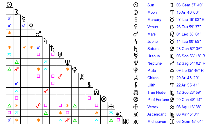 Sun | 3 Gemini 38 | 3 Gemini 46 | 20 Cancer 26 |