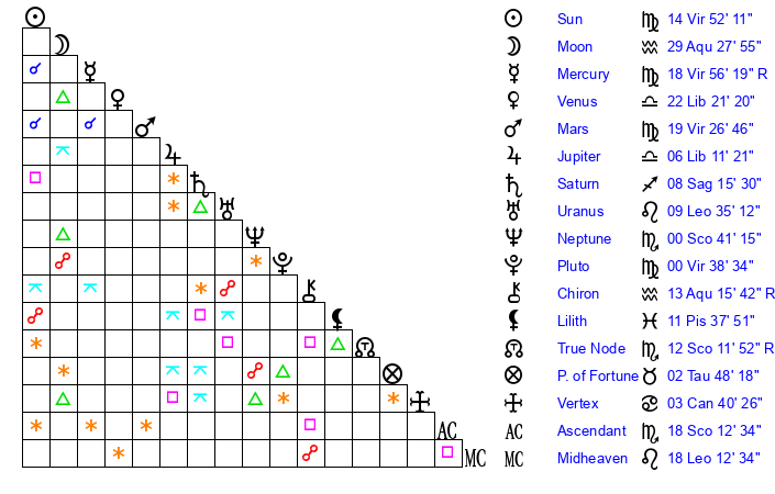 | Mercury | 18 Virgo 56 | 10 Virgo 7 | 4 Sagittarius 37 |
