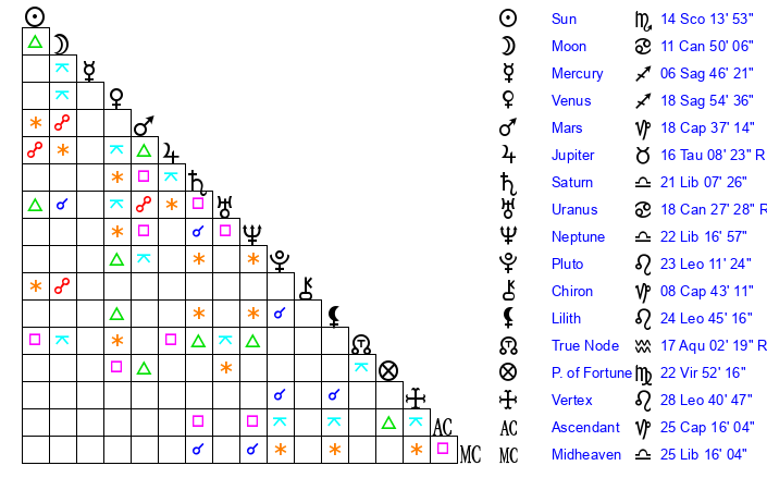 | Saturn | 21 Libra 36 | 25 Pisces 27 | 27 Libra 32 |