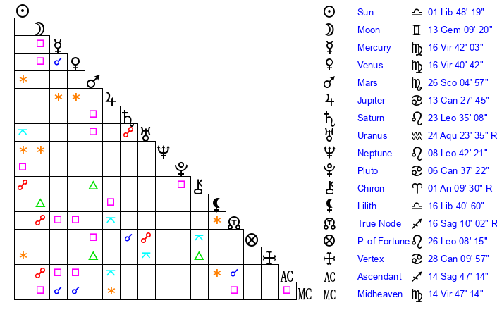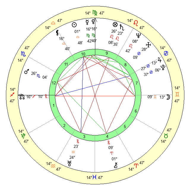 | Moon | 13 Gemini 2 | 15 Scorpio 55 | 5 Taurus 59 |