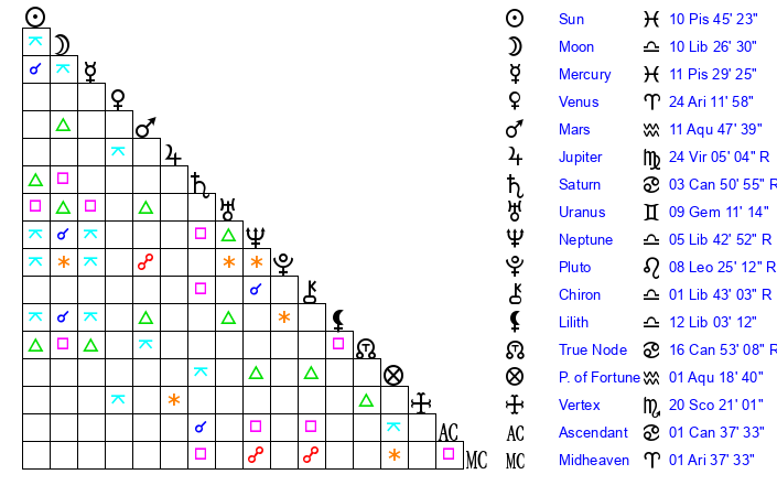 | Neptune | 5 Libra 43 | 28 Pisces 55 | 3 Libra 49 |