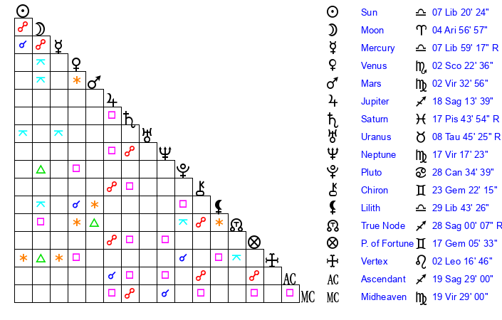 | Neptune | 17 Virgo 17 | 0 Aries 32 | 18 Virgo 56 |