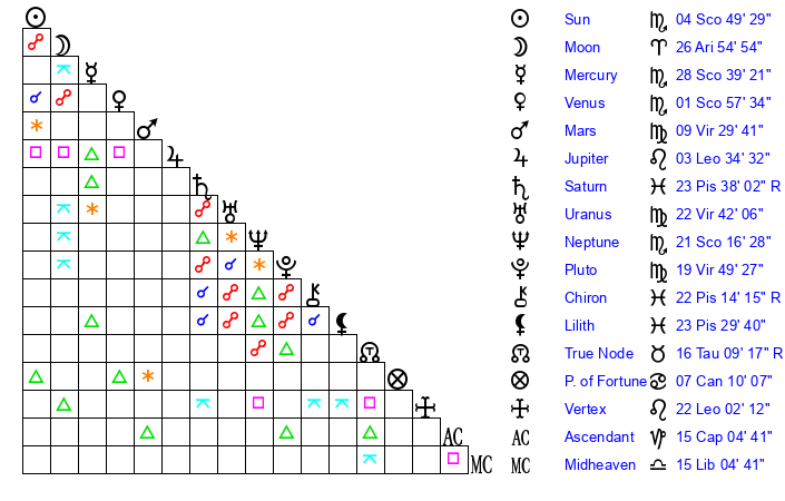 Neptune | 21 Scorpio 17 | 27 Pisces 33 | 23 Scorpio 21 |