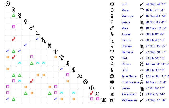 | Sun | 24 Sagittarius 55 | 25 Sagittarius 14 | 9 Aquarius 43 |
