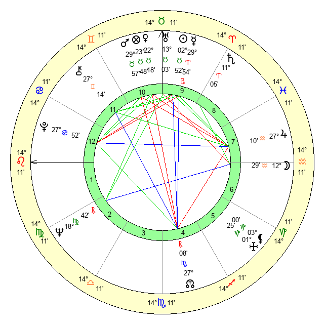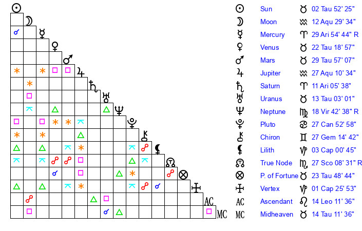| Moon | 12 Aquarius 14 | 6 Pisces 54 | 16 Aries 24 |