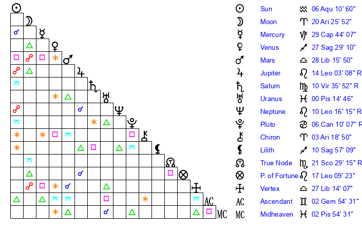 | Moon | 20 Aries 30 | 11 Capricorn 0 | 22 Aquarius 7 |