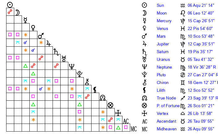 | Sun | 6 Aquarius 21 | 7 Aquarius 0 | 4 Taurus 5 |