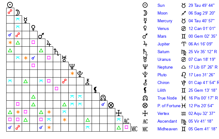 | Sun | 29 Taurus 49 | 0 Gemini 53 | 10 Leo 32 |