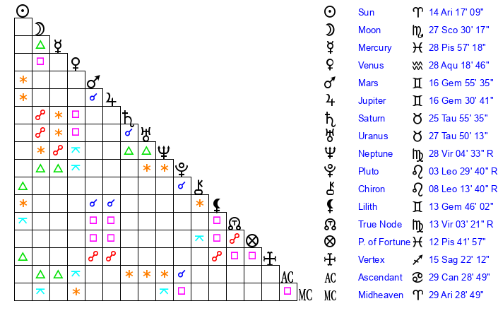 | Sun | 14 Aries 17 | 15 Aries 10 | 4 Cancer 26 |