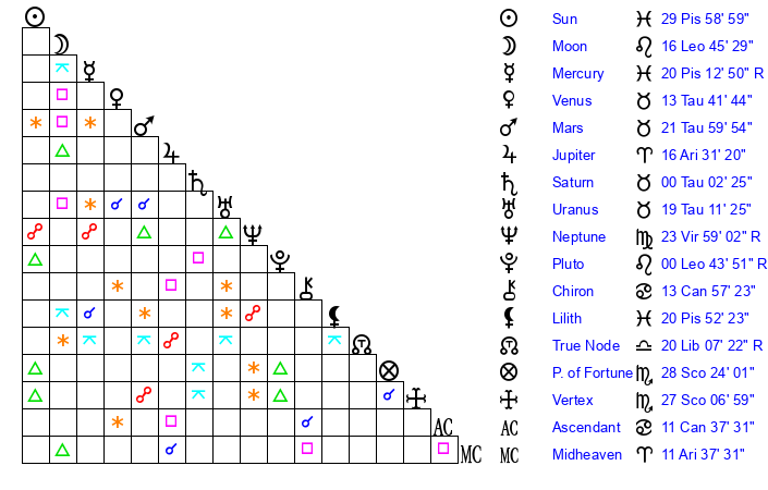 | Mercury | 20 Pisces 12 | 7 Aries 39 | 14 Cancer 50 |