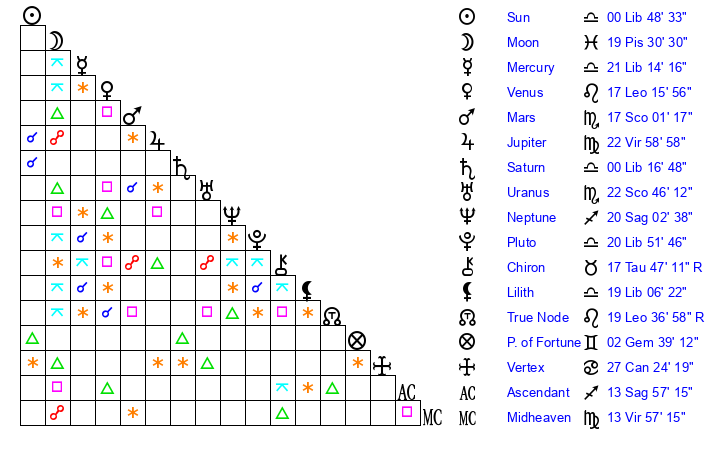 | Moon | 19 Pisces 29 | 21 Libra 57 | 13 Scorpio 48 |