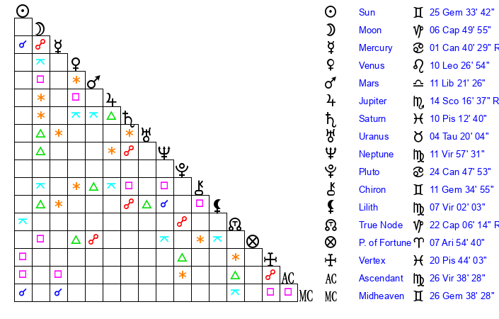 | Moon | 6 Capricorn 51 | 12 Pisces 43 | 2 Taurus 14 |