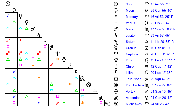 | Sun | 13 Aries 55 | 14 Aries 14 | 24 Gemini 32 |
