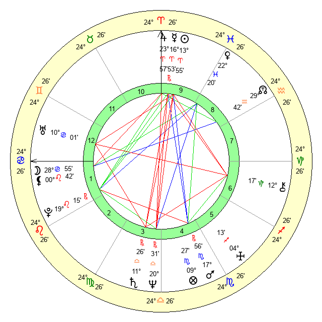 | Moon | 28 Cancer 54 | 27 Gemini 15 | 5 Aries 57 |