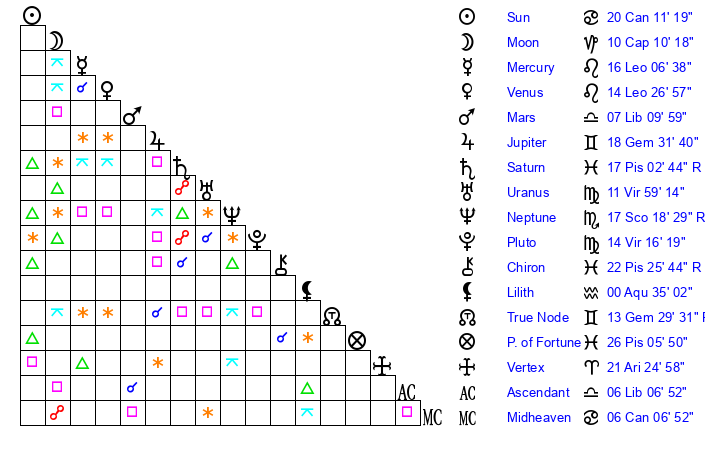 Moon | 10 Capricorn 6 | 14 Aquarius 5 | 15 Pisces 48 |