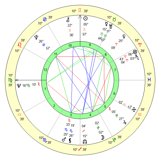 | Sun | 5 Gemini 57 | 6 Gemini 39 | 0 Virgo 7 |