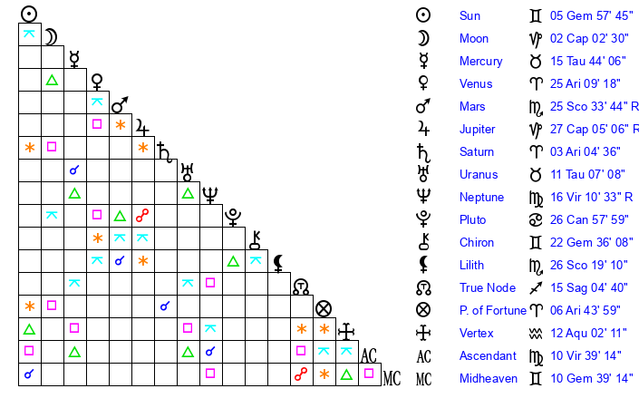 | Moon | 2 Capricorn 3 | 14 Gemini 53 | 21 Pisces 9 |