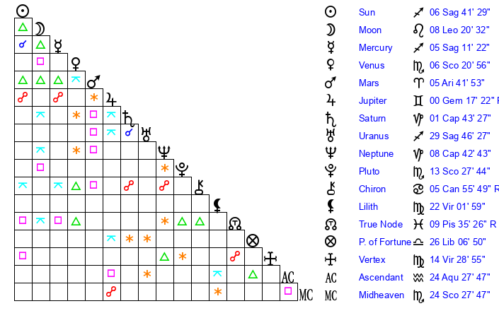 | Moon | 8 Leo 24 | 11 Pisces 51 | 5 Sagittarius 13 |