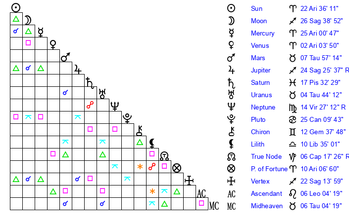 | Sun | 22 Aries 36 | 23 Aries 2 | 18 Cancer 13 |