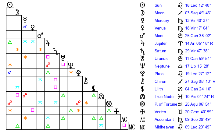| Moon | 3 Sagittarius 48 | 19 Pisces 42 | 19 Leo 16 |