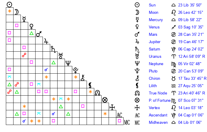 | Sun | 23 Libra 36 | 24 Libra 34 | 29 Capricorn 41 |