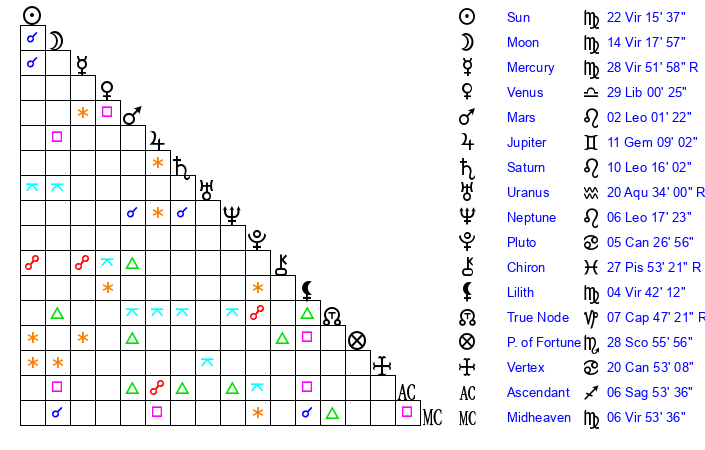 | Moon | 14 Virgo 21 | 9 Cancer 23 | 29 Leo 16 |