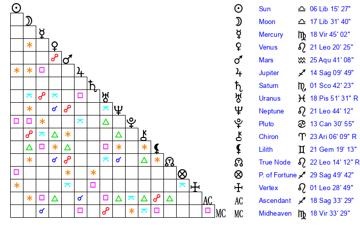 | Sun | 6 Libra 16 | 6 Libra 48 | 17 Capricorn 56 |