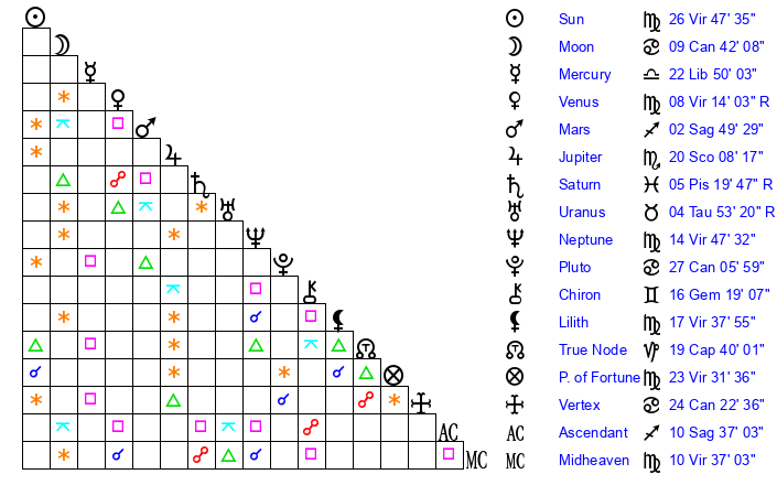 | Sun | 26 Virgo 47 | 27 Virgo 59 | 26 Sagittarius 52 |