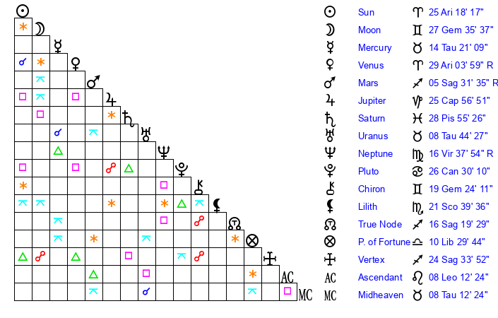 | Moon | 27 Gemini 36 | 25 Scorpio 10 | 18 Virgo 53 |