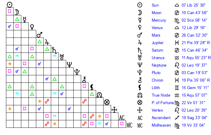 | Moon | 10 Cancer 45 | 28 Capricorn 27 | 21 Cancer 16 |