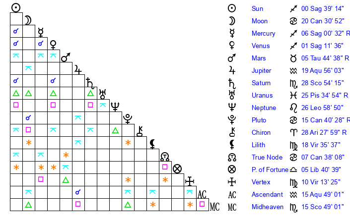 | Saturn | 29 Scorpio 20 | 12 Pisces 41 | 7 Sagittarius 52 |