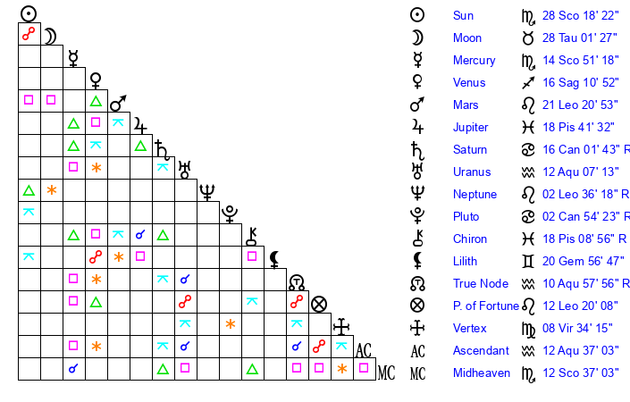 | Sun | 28 Scorpio 18 | 29 Scorpio 53 | 18 Pisces 48 |