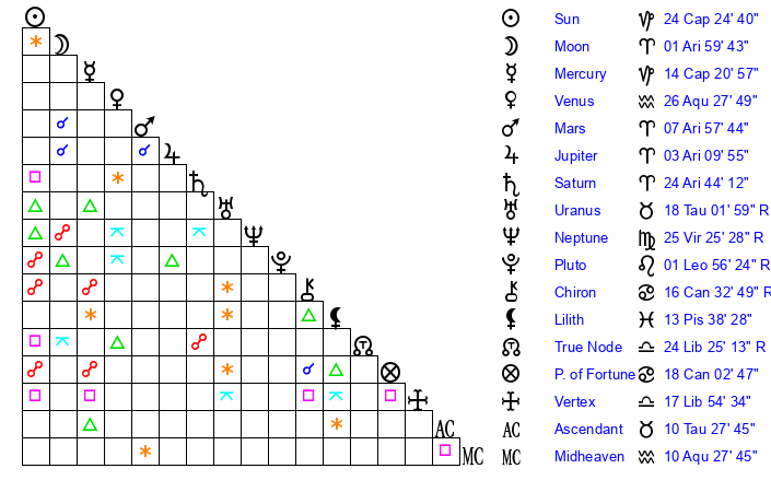 | Sun | 24 Capricorn 25 | 25 Capricorn 48 | 19 Aries 41 |