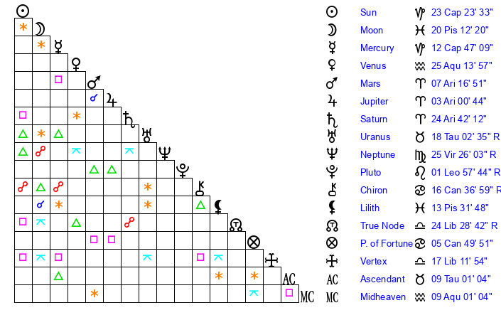 | Sun | 23 Capricorn 23 | 24 Capricorn 47 | 18 Aries 42 |