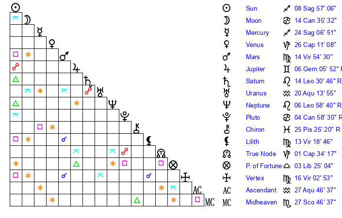 | Sun | 8 Sagittarius 57 | 10 Sagittarius 0 | 27 Pisces 17 |