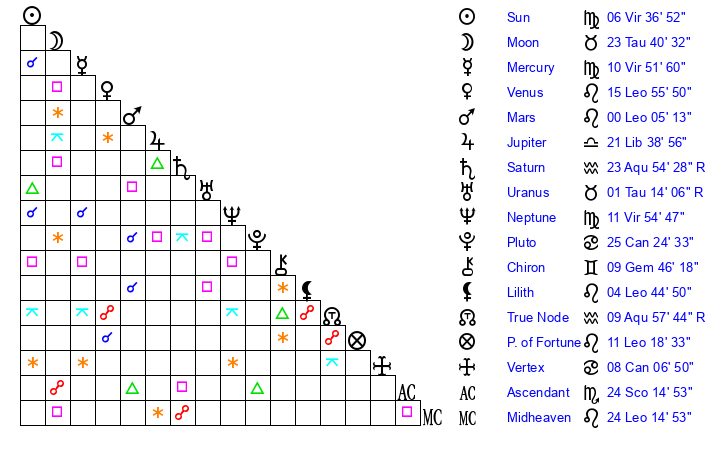 | Neptune | 11 Virgo 54 | 1 Aries 23 | 14 Virgo 29 |