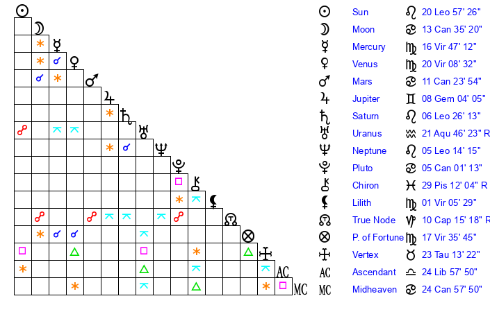 | Venus | 20 Virgo 9 | 16 Cancer 34 | 24 Capricorn 48 |